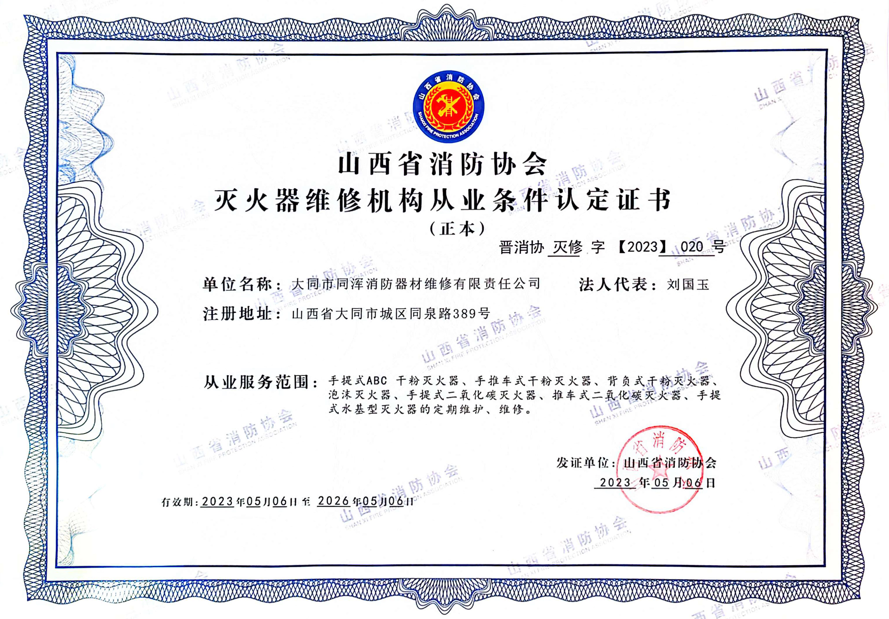 大同市同渾消防器材維修有限責任公司,位于大同市同泉路389號,始建于2000年,是公安部消防局定點銷售和維修的企業(yè),歷經多年的創(chuàng)建、發(fā)展和拼搏,現有多家消防器材廠商供應我公司,并有現代化維修設備,標準的廠房,嚴格的管理,優(yōu)良的設備,良好的服務并受到各行各業(yè)的好評。總經理劉國玉嚴格管理,嚴格要求,精益求精,認真負責,帶領團隊熱烈歡迎各界朋友顧客光臨。